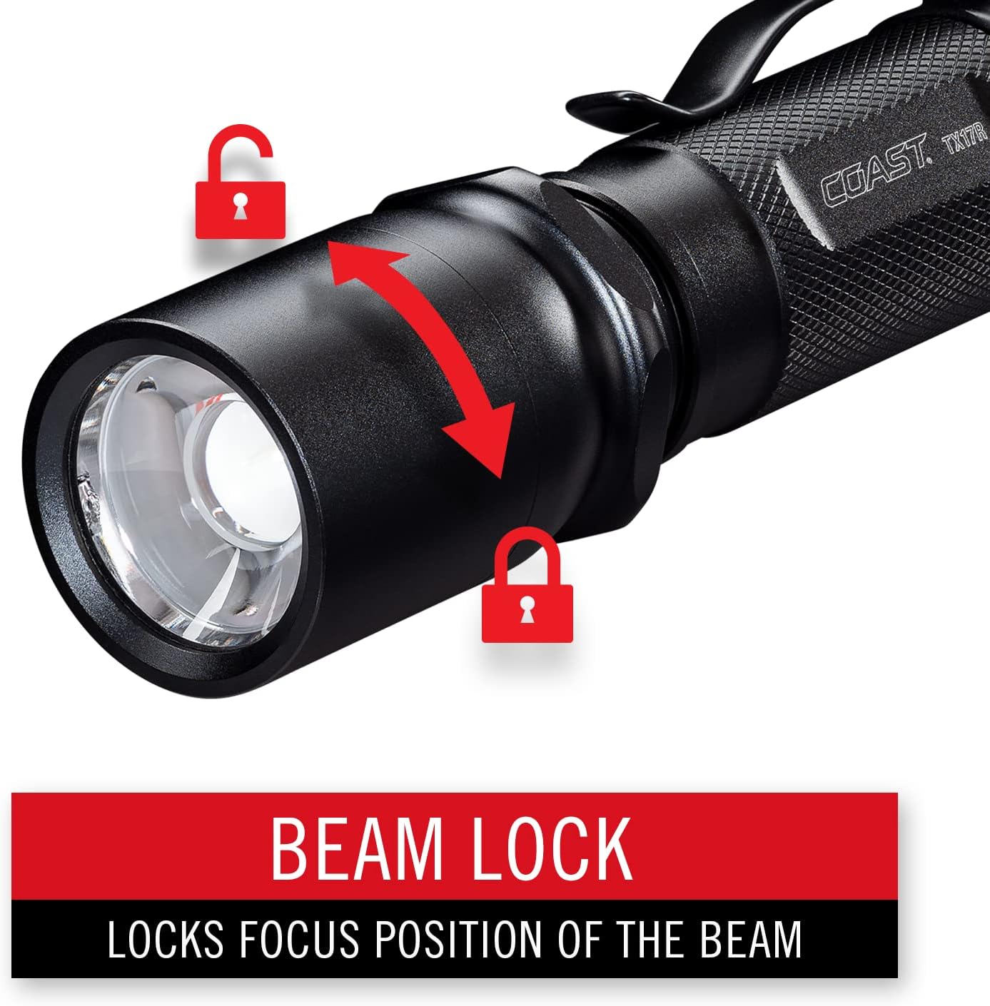 Configura el haz para que quede como te gusta. La tecnología COAST BEAM LOCK® hace que nuestro sistema SLIDE FOCUS® sea aún más valioso, con la opción de bloquear la viga en su lugar en un punto, inundación o en cualquier punto intermedio. Al girar el cabezal de la luz hacia la izquierda se bloquea el haz en su lugar, y al girarlo hacia la derecha se libera el mecanismo deslizante para que vuelva a moverse.