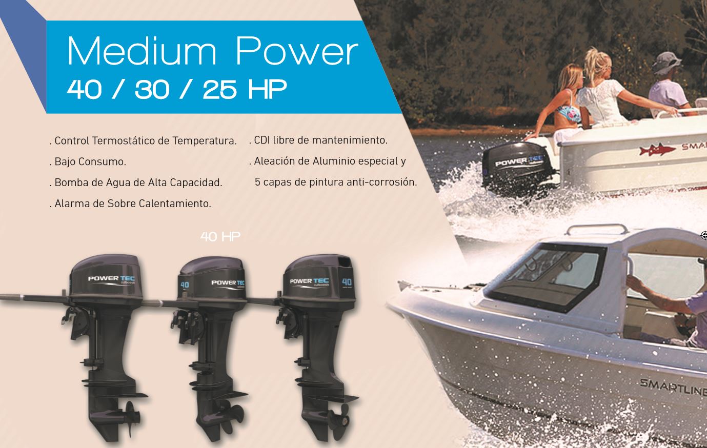 Los motores fuera de borda PowerTec están fabricados con altos estándares de calidad y estricto cumplimiento con las normas ISO y CE. La combinación de altos niveles de rendimiento y fiabilidad con excelente accesibilidad y atención al cliente convierten a PowerTec en un gran valor. Los motores de 2 tiempos de 40 HP se caracterizan por su gran potencia y bajo consumo, control termostatico de temperatura y alarma de sobre calientamiento.